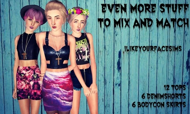 12 tops, 6 denim shorts, and 6 bodycon skirts.