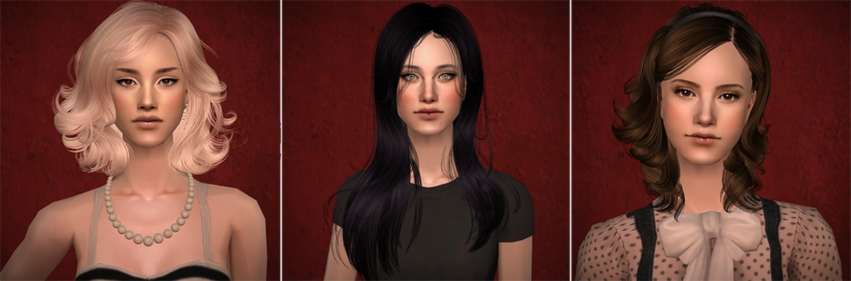 "Hey everyone! I said at my tumblr I would post these yesterday but I couldn't D: I ended up retexturing only 3 hairs and not 4 because Newsea's Endless Song is just... huge and I didn't like the mapping. So on to the good stuff (I hope xD)! Every hair comes in all Pooklet's naturals, Io colors and my Eva colors (separate link), they are binned and familied, meshes are included and elders go gray.