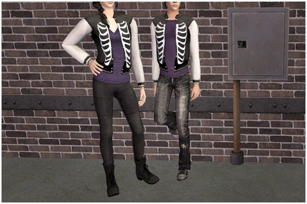 This is very similar to the original replacement I posted, except it has a purple shirt. The female credits are the same. The male is a mashup of this mesh and Jacci Rocker's separated letterman. The skull pattern was by Nilou, and I recoloured it to be black and edited it a little.