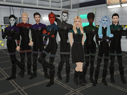 This is seven recolours of a space uniform I made up a long while back. It's a heavily edited version of one of SynapticSims' templates with a coms unit (I think it's DS9) on it. There's also a dress version, using Io's jersey dress. The black boots are Syn's biker boots.