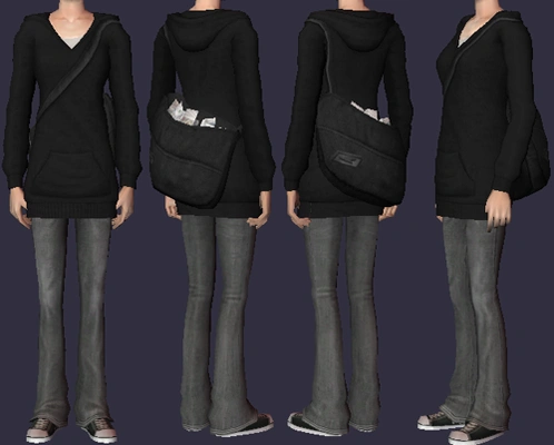I am pretty much sick of the sight of these. I'm still not satisfied with the straps and such, but I just don't want to work on them any more if I'm honest. They work just fine, I just hate texturing. :) These are Amaryll's Winter Sweater outfits converted to all ages and genders by Trapping. I figured they work for an all seasons look and it's nice to have a consistent uniform. For some reason all my delivery sims were female, so there's no male pictures, but they look basically the same. Blue for adult mail, red for teen paper. Separated by age.