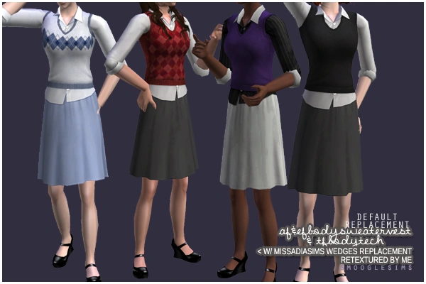 This was originally replaced by Miss Adia, here. And while I really don't care for those blocky wedge things, they're probably a lot more acceptable to others than those socks and loafers the maxis mesh comes with.