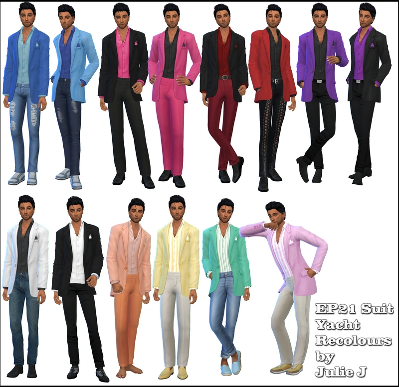 EP21 SuitYacht Recolours by Julie J You need the new Royalty & Legacy EP to see these in game Male - Teen to Elder Everyday/Formal/Party wear Has own thumbnail DOWNLOAD