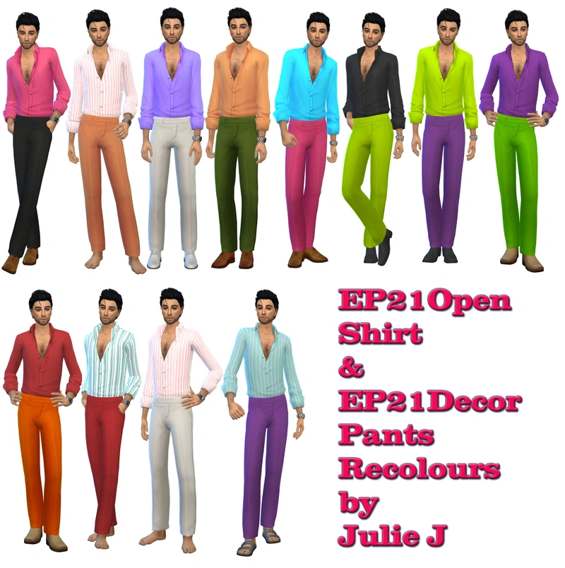 TS4: EP21OpenShirt & DecorPants Recolours by Julie J You need the new Royalty & Legacy EP to see these in game Mix and Match Some colour actions used by Pooklet