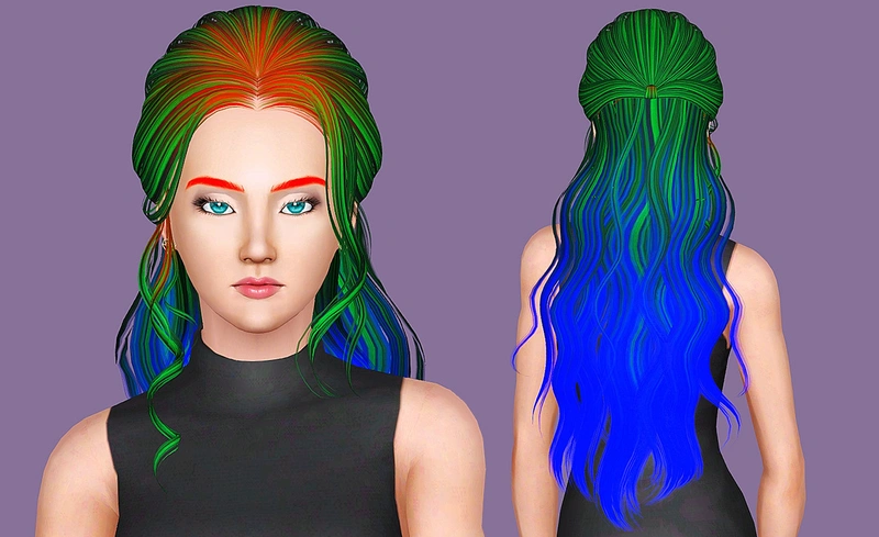 My alpha edit of Zanki FH03 with four colourful Harajuku undercut styles- I get the inspiration for these from various FRUiTS snaps usually, and every so often a hair mesh will come up with just the right scalp texture to do another batch, aha. Drawing on the sim’s head is always a good time. The colours are a mix of the Afterglow and Pooklet’s actions.