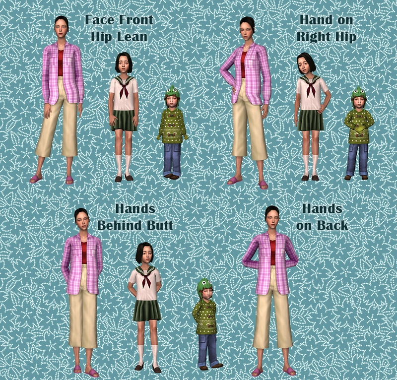 Nice, neutral poses for BodyShop Mechanic! These are four poses from MDPās Posebox 1, with some matching child and toddler poses from DeeDee's Kid Posebox and Little Toddler Posebox.