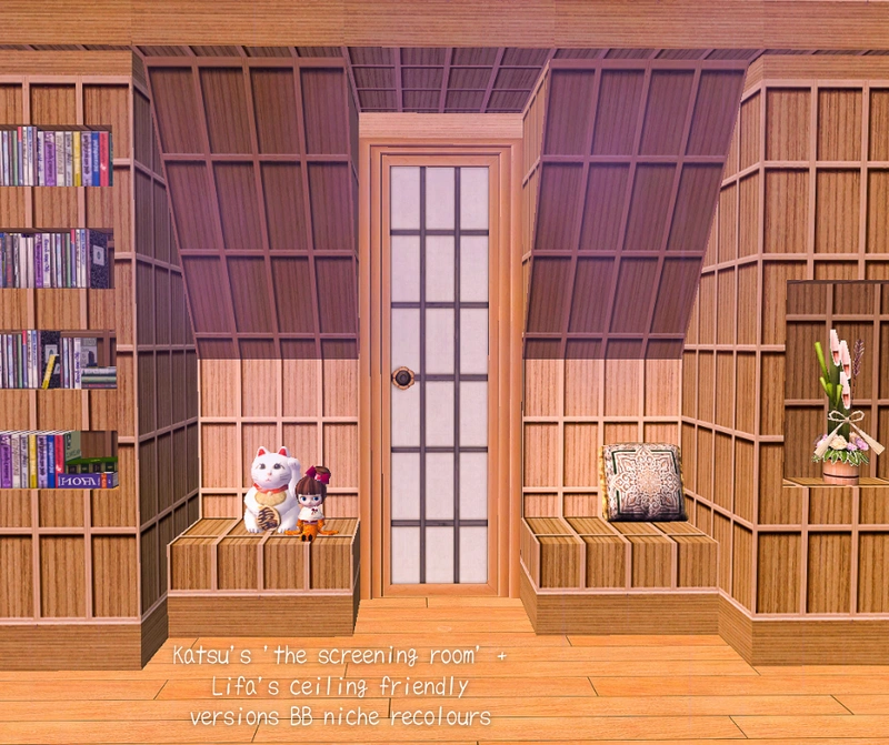 hopefully this comes in handy for someone! These are BB's nooks & niches in maxis 'the screening room' wall + @withlovefromsimtown's ceiling friendly recolours. No meshes included this time just