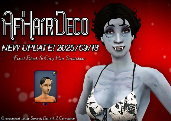 This is afhairdeco replaced with nonsensical-pixels' 4t2 Conversion of Simandy's Betty Hair. The polycount is the same as the original (9592, unanimated). It requires The Sims 2: Open For Business. It has been tested on both The Sims 2: Ultimate Collection and The Sims 2: Legacy Collection. There are no known issues at this time.