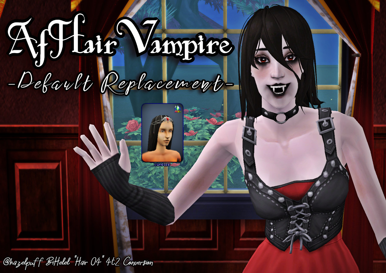 Sul sul! This is afhairvampire replaced with @hazelpuff's 4t2 Conversion of BiHelel's "Hair 04". The polycount is the same as the original (12k). It requires The Sims 2: Nightlife in order to work. It has been tested on both The Sims 2: Ultimate Collection and The Sims 2: Legacy Collection. There are no known issues at this time.