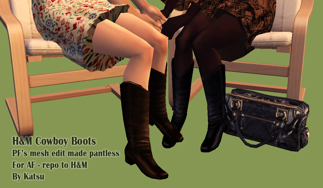 The H&M cowboy boots have been made pantless before, but not quite this way- the boots are a separate texture group (which makes the repository work), and I really love the way PF edited the shape of the boots ^^