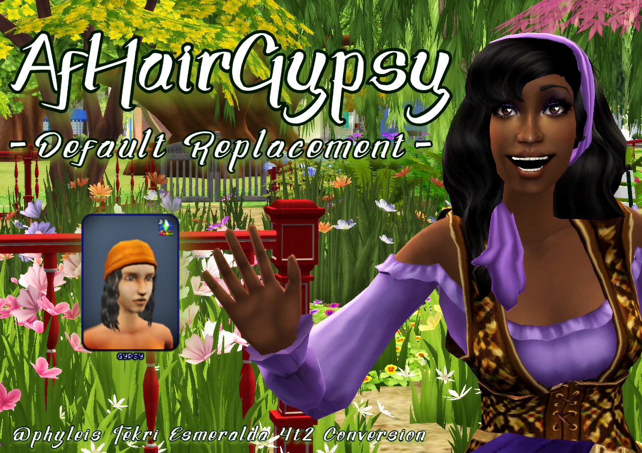 Afhairgypsy is replaced with @phyleis' 4t2 Conversion of Tekri's Esmeralda Hair. The polycount is the same as the original (12.9k). I edited the textures so that the accessory has different colours per hair swatch (the original purple accessory is kept for the black hair swatch, the blonde swatch has blue, red has green, brown has yellow, and grey has orange). It is available for adults and elders. It requires The Sims 2: Nightlife in order to work.