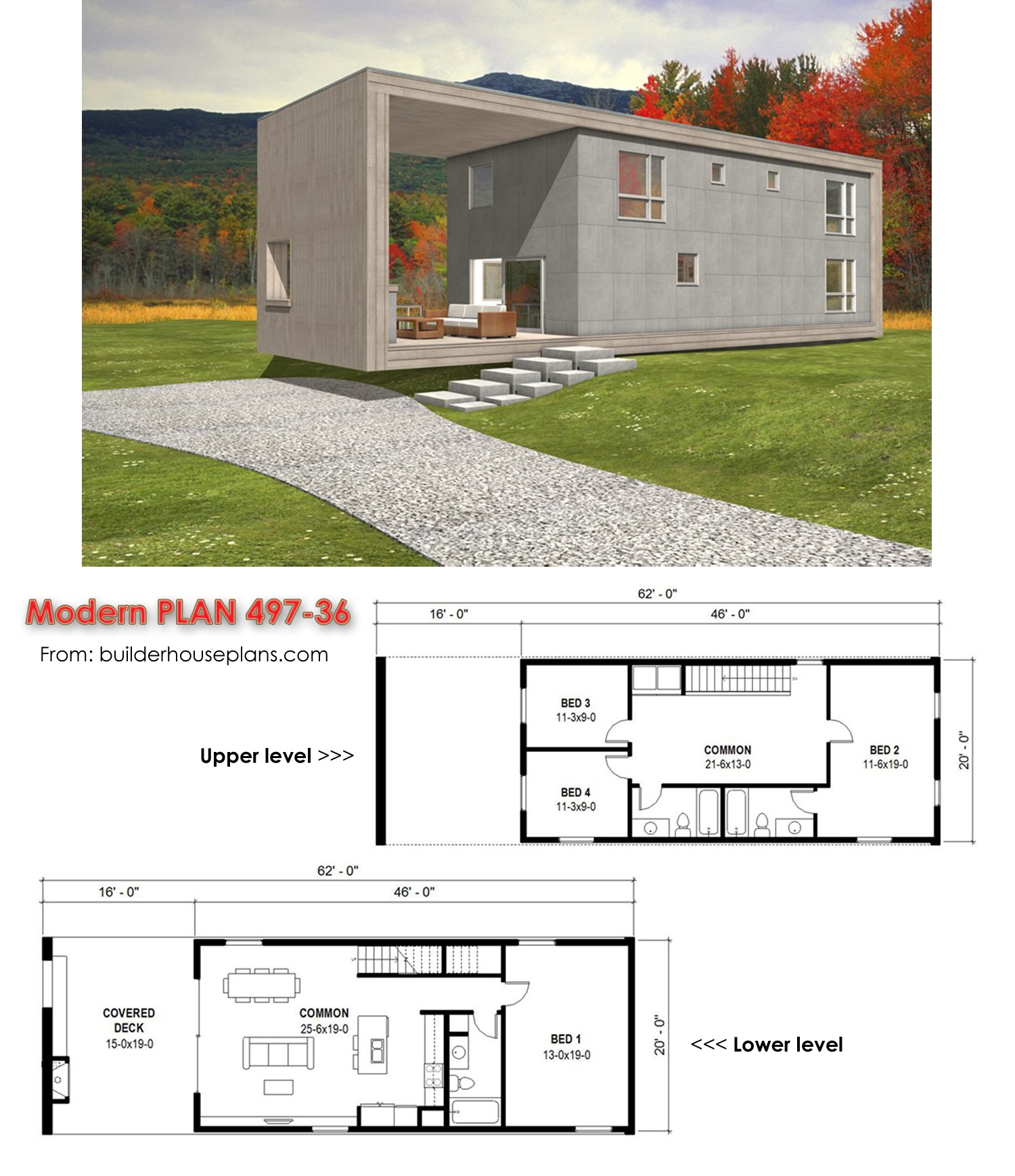 The brochure says, quote: "This design embraces high energy efficiency and modern simplicity. The house shape, location of windows and use of exterior window shading make this design optimal for southern exposure and passive solar heat gains in the cold winter months. The simplicity of its form and use of modern cladding materials such as fiber cement panels allows this design to integrate well with a variety of lot conditions. As with many modern homes, this house plan is very open. Upon entry, you will encounter a large common room. A large guest bedroom is on the first floor. The large sliders out to the deck provide a bridge between indoor and outdoor space. The use of materials in the kitchen such as glass tile backsplash, flush veneer cabinets, composite white countertops and stainless steel appliances provides a clean modern look. The open theme continues upstairs with a multi use open room. This area makes a great space for a home office or child’s play room. There are three bedrooms upstairs, two baths and a laundry closet."