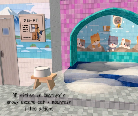 So I mainly made these to make some more interesting onsen builds, these are BB's nooks & niches in Xmathyx's snowy escape cat and mountain add on tiles (which come in both wall and floor options).No meshes included this time just because there's so many of them out there, just make sure you have the master for them to work!