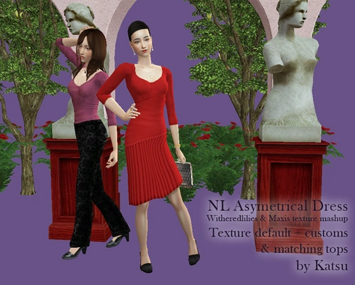 I'm not 100% happy with what I ended up with here, but it's good enough that I think I'm finished working on it now, aha. I retextured the asymmetrical dress from NL using a bit of Witheredlilies textures, combining them with the original maxis textures so they work with the original mesh and retain the actual asymmetrical part; essentially this is everything I liked about both versions, with nothing I didn't. Then I made matching tops!