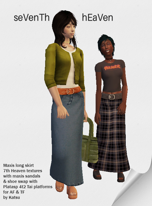 Thought I'd take another crack at my 7th heaven skirts, and shoeswapped them again with a retexture of Platasp's 4t2 Serenity Tai Platforms ^^ Though this time I've also done an option with the maxis sandals, and my new mesh is much more efficient than my previous shoeswap, can be repo'd to maxis textures, and doesn't have the same mapping issues.