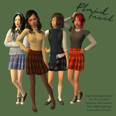 They come in 8 plaid patterns and 4 shoe options; AL loafers on my seifuku skirt mesh, Impish Parody ( from Trapping's pantless version)/ Yuxi low sneakers on my seifuku skirt shoeswap mesh, flats and H&M high tops on Sanneke94's shoeswaps of Needlecream's pleated skirt converted to TF. The textures are Needlecream's high waisted skirt with my edits.