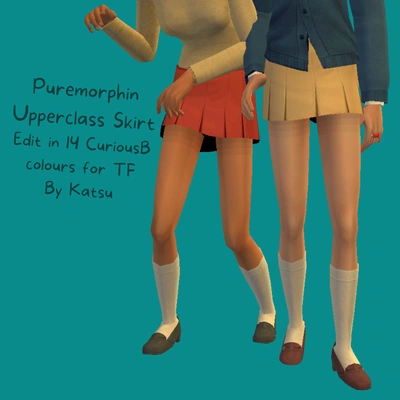 Retexture of Puremorphin's Upperclass mini skirt with loafers- edited the plain pleated skirt texture (originally from bg) so it's pleated all the way around, and gave everything white socks. Available in 14 Curious B colours (okay its 13 CuriousB colours + the maxis beige colour, which is pretty similar to 'sand' anyhow), TF only, everyday/formal. Mesh is included!