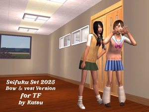 I made a bow tie accessory for CF-AF that works on both the AL/FT sweater vest + FT tech cardigan meshes! the aim was to take advantage of the slightly disheveled look of those to make Kogal style outfits for my teen girls (alongside those Puremorphin skirts), and it works to some extent aha. Its not as baggy as the SK outfit I converted for TF before, but it does look slightly nicer in the game, and there's more variety with separates. I positioned it to give it that hanging off the neck look Kogals favour ^^ I expect that these would work with different tops for different looks, too, as they're quite neutral. to make these I just nicked a bow off of one of Magical Girl Sandbox's seifuku uniforms (Which one? Not sure, the bows are the same for the most part), resized it, made it an accessory + recoloured it in the same 16 Curious B colours I've been using! Available binned as accessories or BV necklaces ♥