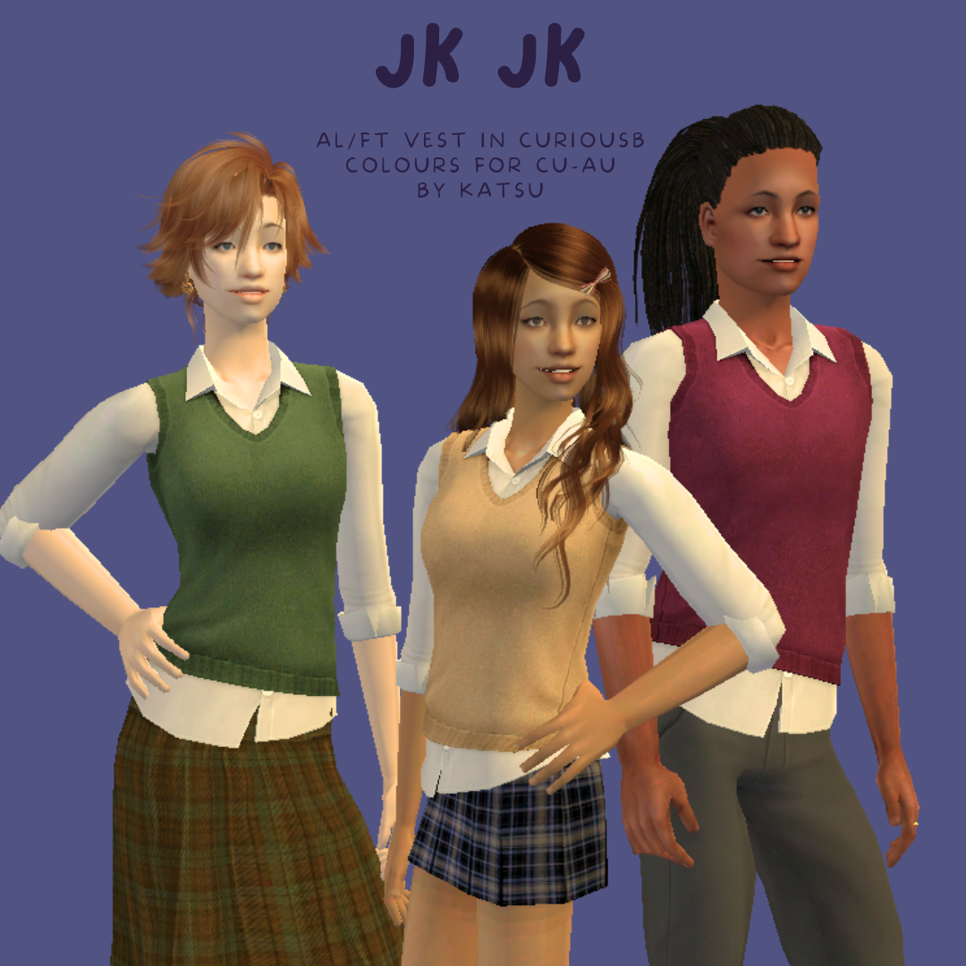 The meshes are (included) the AL/FT Sweater vest separated + converted by Amaryll & Skell for CU-AU, everyday + formal. In 16 Curious B colours, available as standalone or repo: CU + TM repo to AM, TF repo to AF (for proper bust shading purposes)