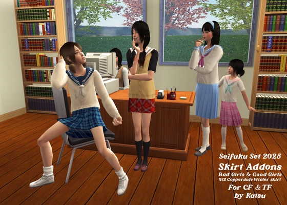 It makes me happy to make customized uniforms for each sim by combining the skirts and tops! Other skirts I've made that'll fit with these are the previously linked Needlecream skirts in Curious B colours and plaids, as well as my retexture or Puremorphin's upperclass skirt, also in Curious B colours and plaids.