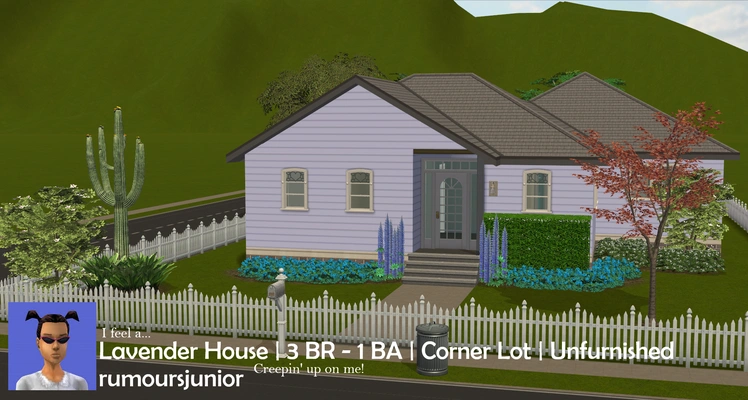 This house is loosely based off of my house but there is a different layout and of course my house isn't lavender. Excuse the Taylor Swift reference on the thumbnail, it's corny. This house has an attached garage, 3 Bedrooms, a bathroom with a tub, a kitchen, 2 areas which can be used as a living or dining room, an extra closet, an expansive yard and the wonderful white picket fence.
