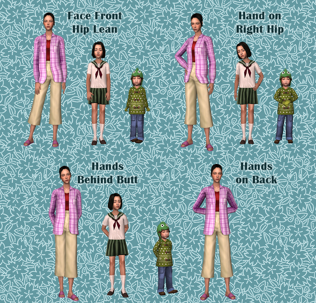 As you can see in the preview, the 'hands behind butt' and 'hands on back' poses share the same toddler and child poses, they just seemed like the best choice for both!