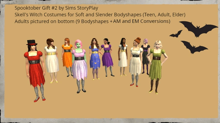 Spooktober Gift #2 is here! So, I went a little crazy and converted Skell 's witch costume for many bodyshapes (and I still have curvy to do!) All colors pictured above (9). Swatch is on previous post for muscle girls here. Download links and info below