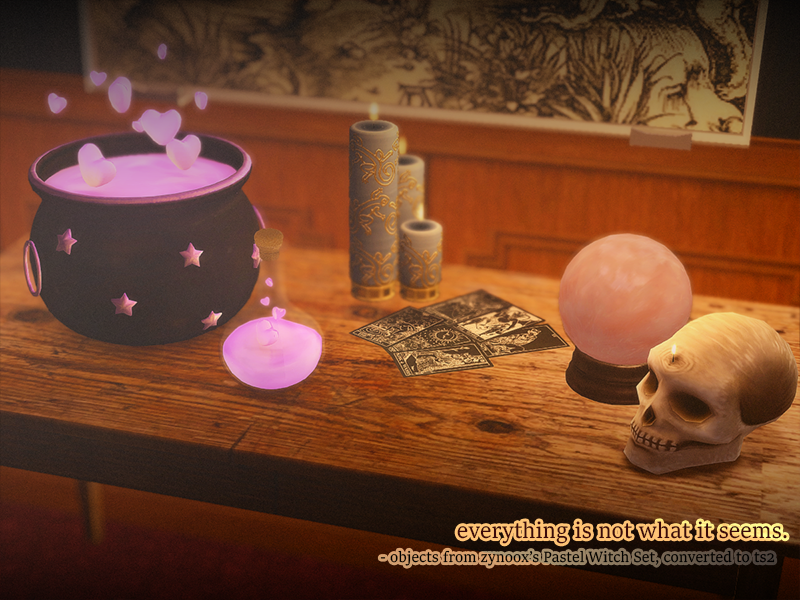 Hi everyone! Happy Halloween!!! For this occasion, I've converted some objects from zynoox's ultra cute Pastel Witch set, specifically the ones centered around potion making and divination. I haven't seen it converted before and I think it's absolutely adorable. The little hearts in the potions!!