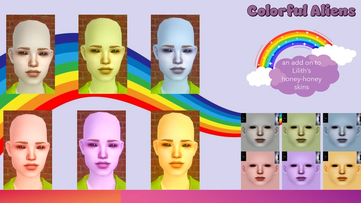 I have tried many different skins, and although there are many that I like very much, I have always loved the Honey skins. Then when Lilith came back with the Honey-Honey skins I would always have them in my game. Poppet Sims over at tumblr did a colorful alien pack with the feathers skins. I had always wanted a honey-honey version and never found one I liked or at least I had not seen any. Now that I have been dabbling with skins, I thought would work on my own version of colorful skins. These cute little freckled face aliens (because I love freckles, so why not) come in grey, pink, green, yellow, green, & purple. Please feel free to enjoy. If there are any issues please let me know so I can fix.