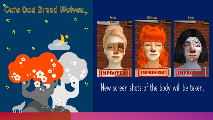 Hello!! Today I bring to you some cute wolves that resemble my dogs. I have an aussie, chihuahua and blue heeler. Here are my versions of all three. The skins are custom I am currently learning to geneticize for a different project so I may add a geneticized version in the future. I used Lilith's Honey custom grey wolf as a base for the fur and used a skin from her honey honey version for skin showing underneath since these are not an overlay, just a custom skin. I also gave them a 4t2 wolf nose from eachuisge-cc tumblr. As usual, please let me know iof there are any issues with the skins so i can fix them. Otherwise please feel free to enjoy, geneticize, default or corelate. :D