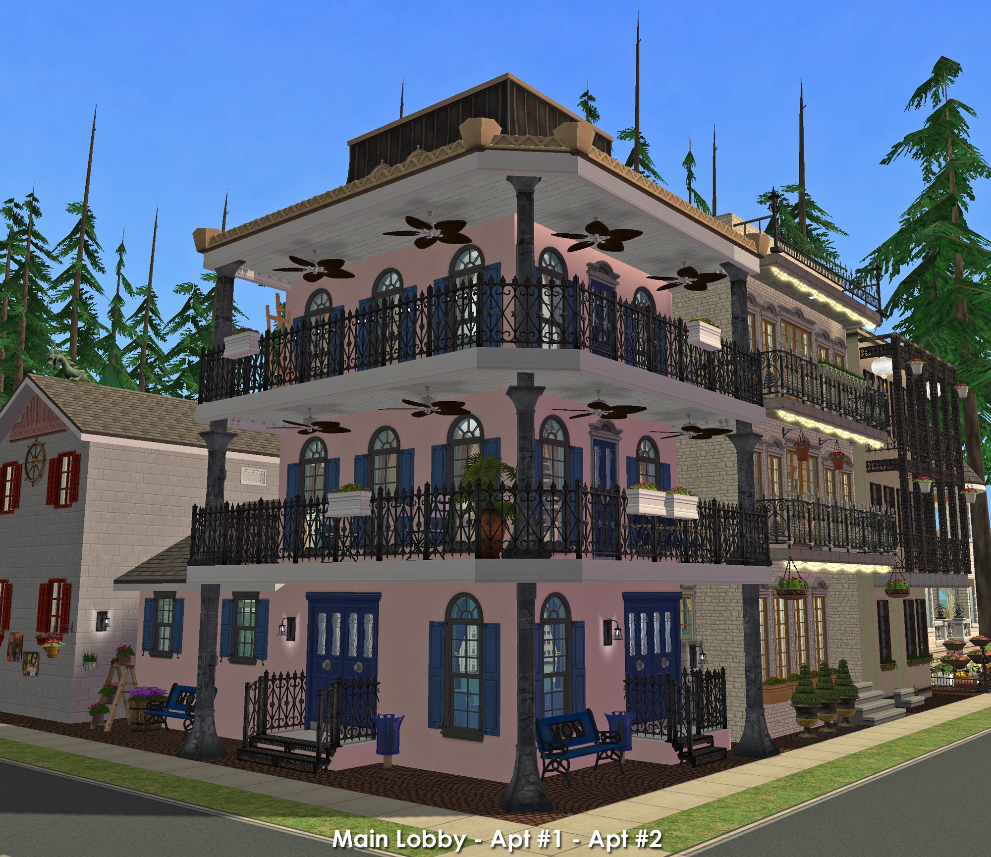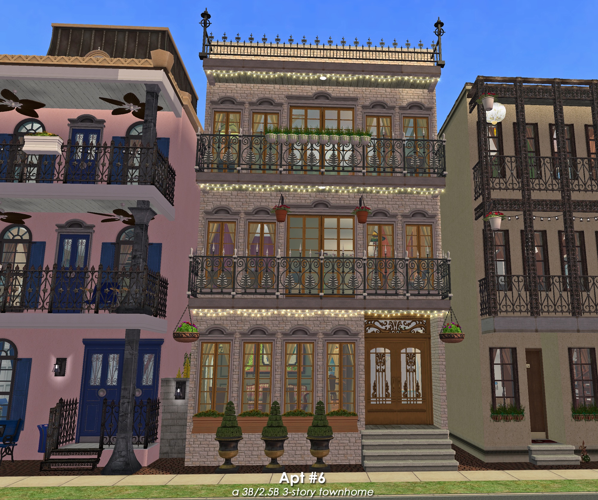 Apt 6 - $3,731 - is a 3B/2.5B townhome w/3-stories, front balconies, and a private deck off the Master Bedroom. ( for the "old money," fancy sim. Maybe a single parent with two kids? )