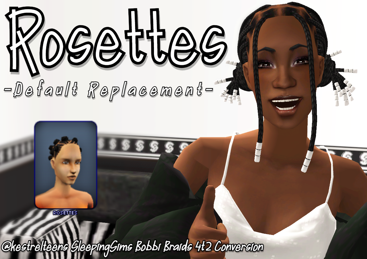 Sul sul! This is ufhairrosettes replaced with @kestrelteen's 4t2 Conversion of sleepingsims' Bobbi Braids V1. The polycount is the same as the original (12,684 poly, animated). It is available for Children, Teens, Adults, & Elders. It should be Base Game Compatible. It has been tested on both Ultimate Collection & Legacy Collection.