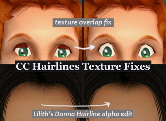 I absolutely love this set of hairlines, there's so many options to fit every type of hairstyle! I recently noticed that some of the textures overlapped with the eye textures for sims (only visible with exaggerated expressions) and edited them to fix that. While I was at it, I tweaked the Donna Hairline to erase the subtle gradient on the forehead. I liked the shading effect but unfortunately it had looked pixelated in my game, as you can see in the preview.