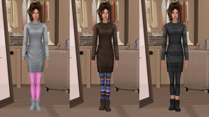 I started on this aggggges ago and over this weekend, since we've been snowed in I decided this would be the perfect time to finish these up! tfbodysweaterdress shoeswapped with Simplicaz’ Winter Booties converted by eir. You have a choice of defaults either with the outfits repo'd to the game files (1st photo) or i did up some custom recolor defaults (2nd pic). Everyday and outerwear categories.