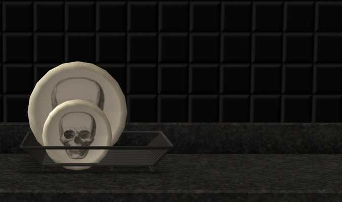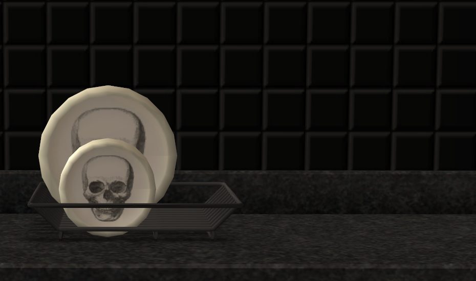 I made some dishes for Boblishman's dish rack to match my defaults. They use the same texture for the dessert and dinner plates, so I used the skull. (If anyone knows how to separate it, please let me know.) They've got a B on the back like the mark in the original.