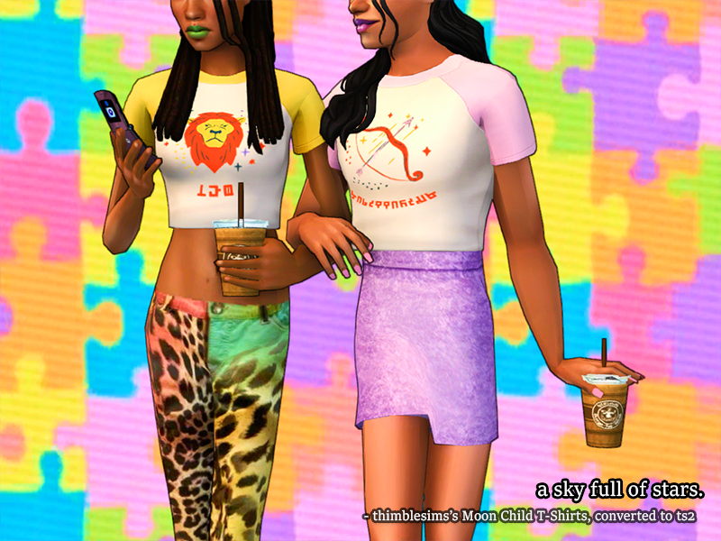 Hey!! We're moving on to clothing, and this particular item I've wanted to convert for months but never got to. These are cute, simple t-shirts for casual everyday wear. All genders, only adults for now. The original meshes, Avril and Angel tops, are by AxA. Lucky for me, both meshes have already been converted by platinumaspiration and imyourjoysims2aspiration respectively (funny username combination btw), so I just had to recolor them. I really enjoy zodiac-themed things and this set is adorable and uses Simlish text so it's perfect to me :3