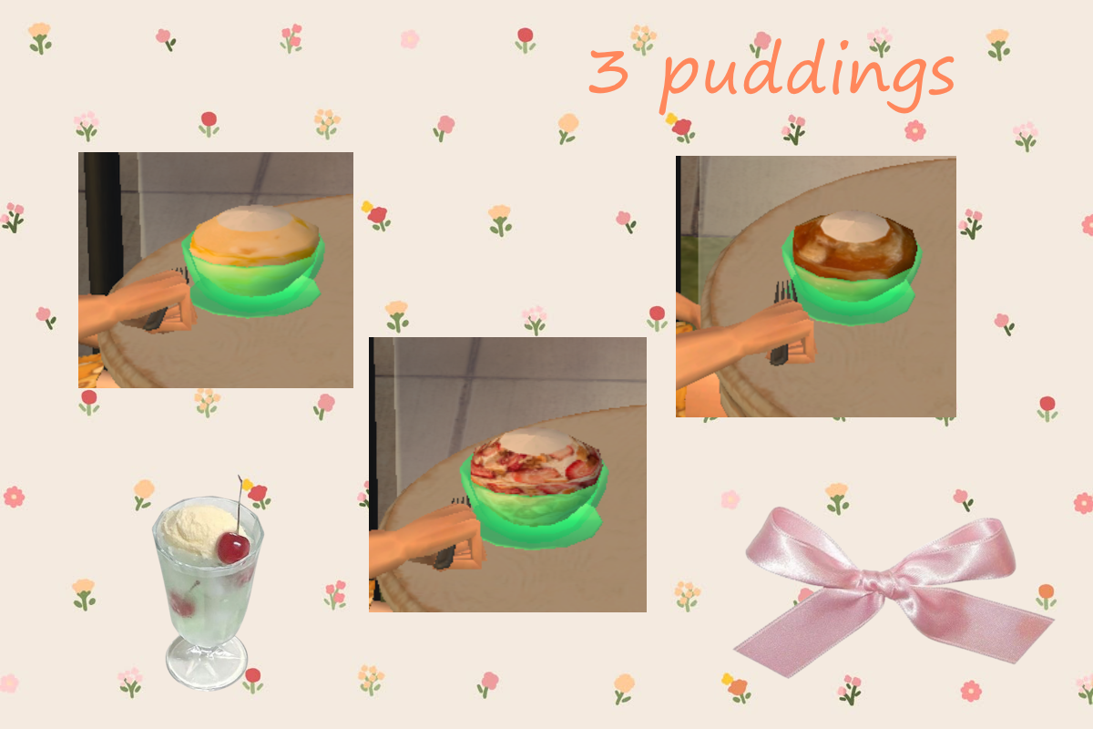 helloo o/ today i bring you 3 puddings (˶ᵔ ᵕ ᵔ˶) these are cloned from TNW's Banana and Oreo puddings which I thought were really cute so I decided to make some more flavors (˶ᵔ ᵕ ᵔ˶) ‹𝟹 please let me know of any issues and make sure you have both TNW's files for the puddings to work properly. they are found under serve dessert. hope you enjoy and like them!