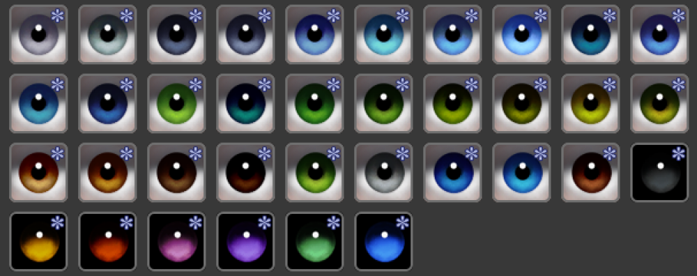 36 custom colors - including the default colors as custom, in case you don't want to replace your defaults with these. For the human colors you have custom only, geneticized, or geneticized and townified options. Pick only ONE. (Genetic scale is based on Maxis's and is set to 1 for brown, hazel, and dark blue, and 2 for grey, green, and light blue).