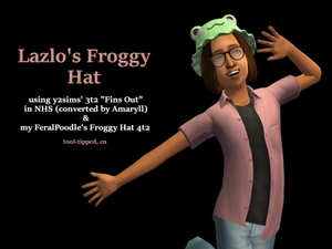 lazlo’s froggy hat good evening simblr! tonight i have this hair with a hat edited onto it, inspired by @simstationdance’s early strangetown and their lazlo who has a froggy hat.