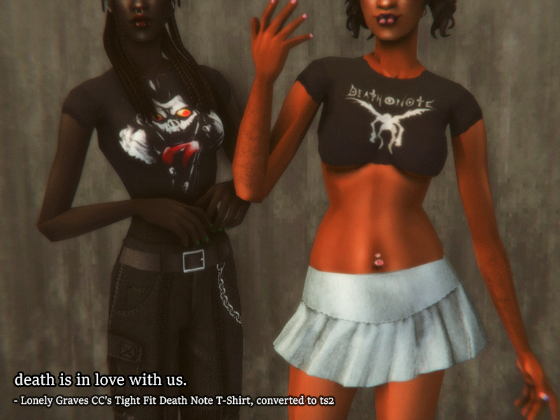 Hey! I simply adore this set of t-shirts, especially the crop tops, so I knew I had to convert them immediately as I saw them. You of course need to have the separates mod to have them show up as pyjama tops. Death Note is peak and so is the stuff that Lonely Graves makes! Enjoy!