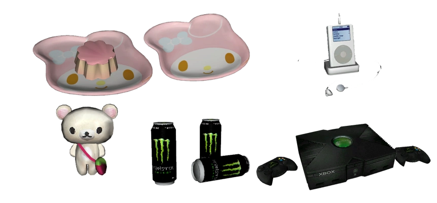 - Poly count: Xbox functional - 2352 poly 2666 verts Xbox deco v1 - 5671 poly 5010 verts Xbox deco v2 - 2755 poly 2740 verts DR gamepad - 1458 poly 1136 verts Ipod (both) - 2644 poly 2413 verts Monster Cans - 2424 poly 1745 verts My Melody Purin Plate - 1530 poly 996 verts My Melody Empty Plate -1154 poly 579 verts Korilakkuma plush - 959 poly 627 verts