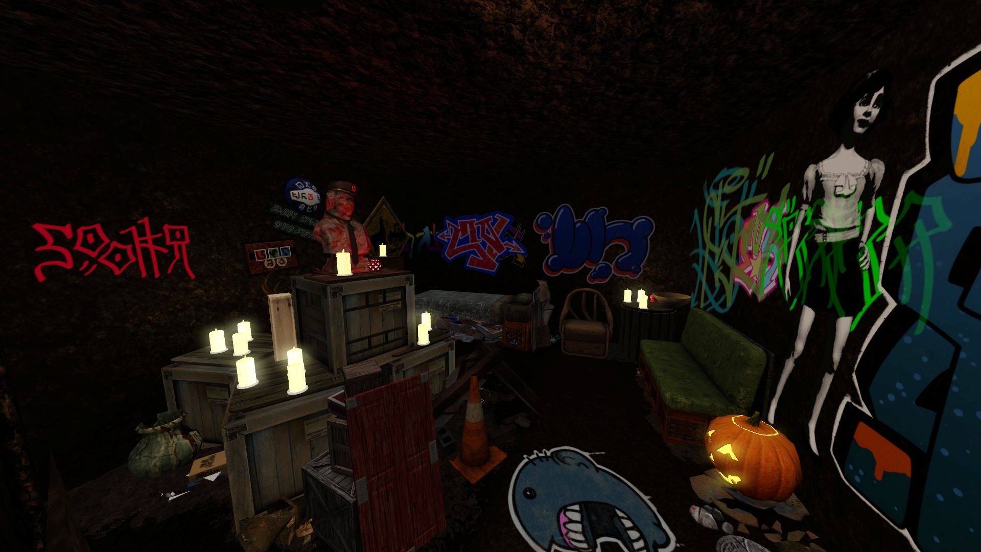 Bitey the Vampire Fish, Plasma Fruit planters, Jack-o-lanterns, Umbrellas, Dominoes, Bookcase, Dresser/Mirror, Stereo, Mini Fridge, All-in-one Bathroom, Bathtub, 4 Vampire Altars (Beds), 1 single bed for victims tired friends, and So. Much. Graffiti!