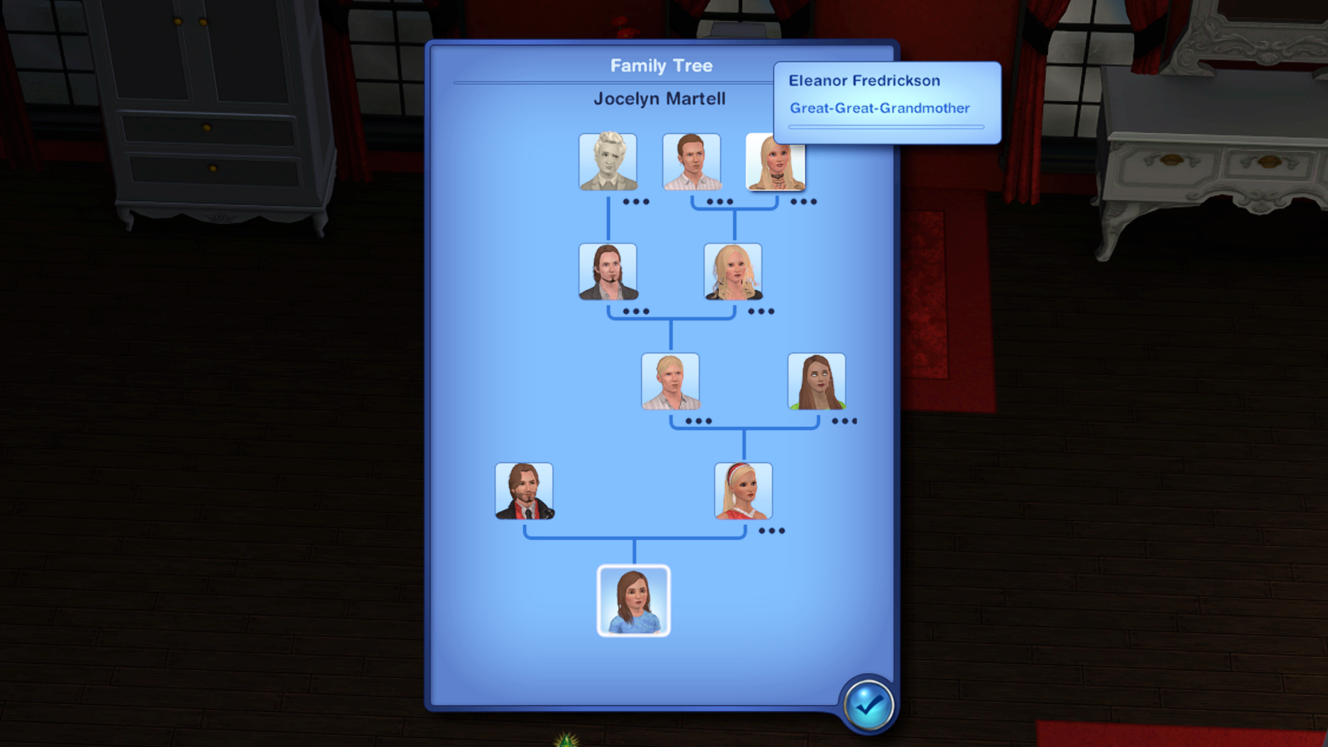 This scales infinitely or up to a limit set in the tuning (for example, a Sim could have a 5th Half-Cousin 4× Removed).