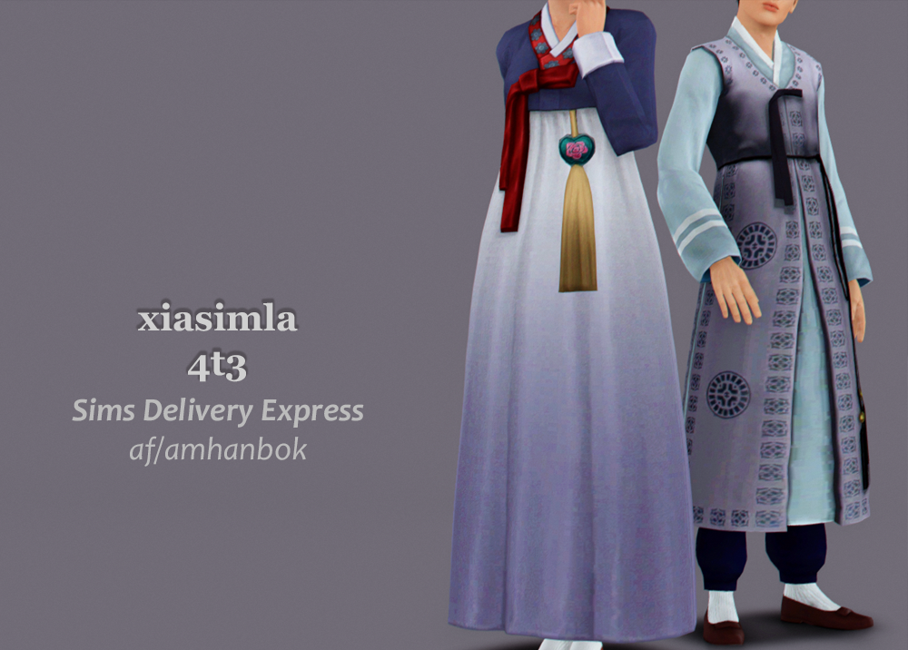 AM Hanbok * For YA/Adult male sims * Enabled for Everyday and Formal, disabled for random * 4.9k poly, 1k textures * 3 partly-recolorable presets with overlays, based on TS4 swatches * Custom thumbnail * All morphs * All LODs * Black specular, so it’s not shiny like Maxis clothing * Compressed