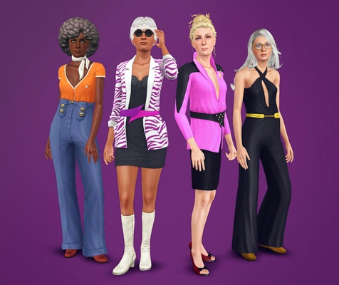 - Polycounts: Bell-Bottom Pants with Scarf 4712, Long Jacket with Belt 4472, Outfit with Shoulder Pads 4622, Uni Jumpsuit 4140.