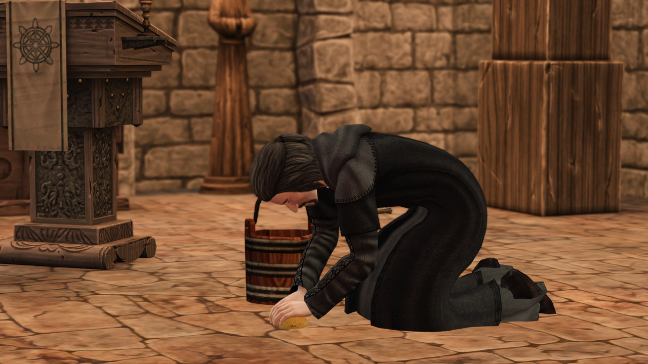 This mod unlocks the quest-specific interaction “Scrub Floor” making it available to all Sims.