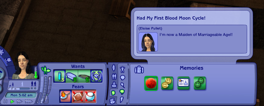 Eloise is a woman now and is officially ready for marriage! This cemented my decision to have Jean set aside her dowry this Quarter, even though money is tight, so that when we cycle back around to them next season, she will be ready to move on. The Dowry for a first daughter of a peasant is $300, so Jean purchased a gold coin worth exactly that much and I dropped it into Eloise's inventory :)