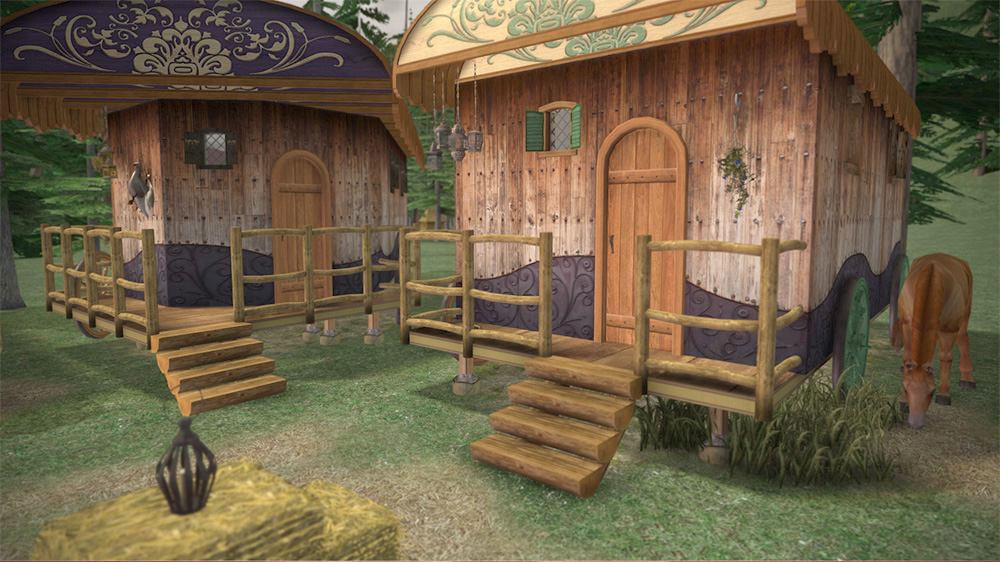 The Faa family lives far out on the fringes of the forest of Dallùbach in a Traveler's camp that is one of my particular favorite places to visit. Kadja , the eldest has just recently allowed her younger brother Danior to move out to a caravan of his own, but she'll be right next door to keep an eye on him. They're still considering whether or not they want to stay in this developing village and for now, earn their way by telling fortunes and playing music for tips.